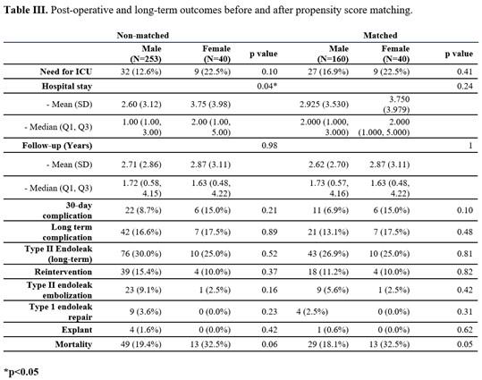P= 0.41). Mean follow-up duration was 2.7 ± 2.9 years for the entire cohort. 30-day (6.9% vs 15.0%. p=0.10) and long-term complications (13.1% vs. 17.5%. p=0.48) although were more prevalent in our female cohort, this was not statistically significant. Type II endoleak rates were 26.9% for males and 25.0% for females (p=0.81). Re-intervention rates were 11.2% for male and 10.0% for female patients (p=0.82). All-cause mortality was no different among sexes (32.5% vs. 18.1%, p=0.05),