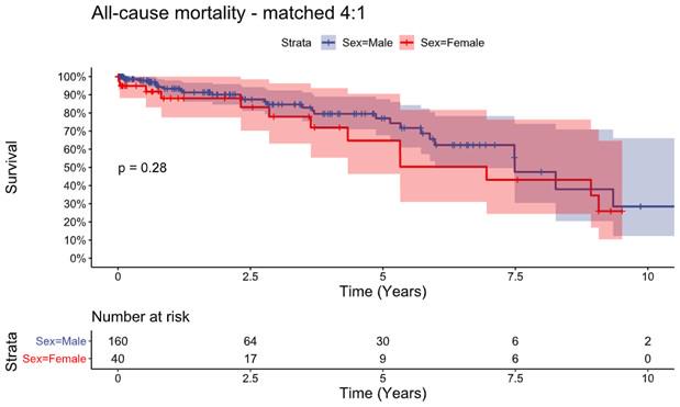 Analysis: Statistical analysis was performed using R® v.4.4.1. Normal distribution was ascertained by the Shapiro-Wilk test. The categorical variables were analyzed using Pearson’s Chi-squared test, and continuous variables with non-parametric distribution were analyzed using the Mann-U-Whitney test. A p-value of <0.05 was considered statistically significant. A 4:1 propensity score matched cohort was obtained using age and type of procedure. Survival analysis was conducted between both sexes in terms of the primary and secondary outcomes. Log-rank test was used to ascertain differences in the survival analysis. Data was obtained and audited before analysis to reduce information bias. All information was collected sequentially in an encrypted database to ensure patient confidentiality of personal information, reducing the risk of information and selection bias by retrieving the information as needed. This work follows the STROBE criteria.