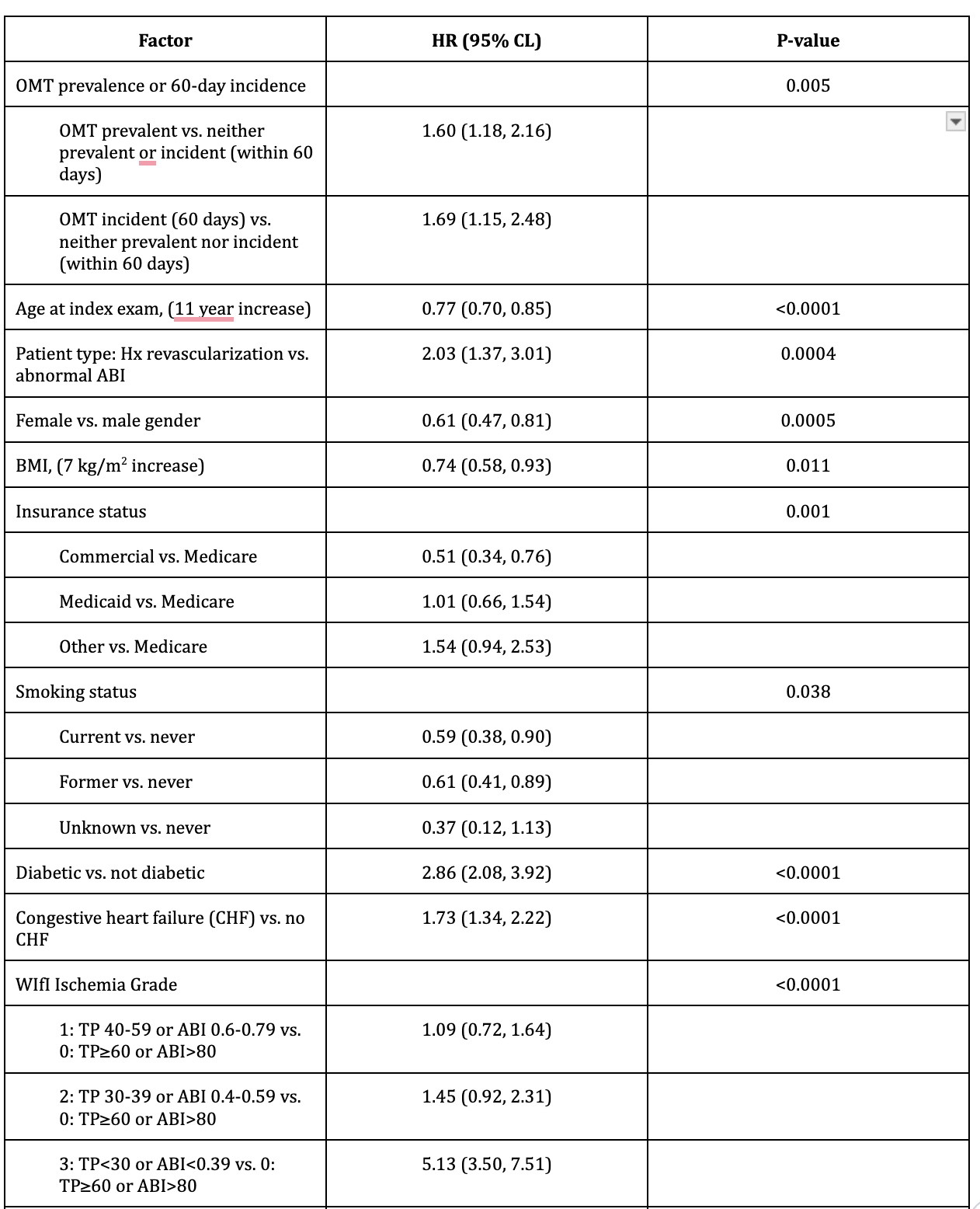 RESULTS: At index vascular study, OMT prevalence was 45.3% and HIOMT 23.6%. The incidence (initiation)/prevalence(continuation) of HIOMT increased to 53.4%, and OMT to 77.1%. MALE occurred in 5.1%. Larger hazard ratios (HR) were observed in patients with prevalent (HR 2.18, 95% CI 1.62- 2.93) and incident OMT within 60 days (HR 2.68, 95% CI 1.85-3.89; p<0.0001) for MALE compared to those without OMT. HIOMT prevalence (HR 1.48, 95% CI 1.13-1.94; p=0.011) was associated with a higher risk of MALE, but not for incident HIOMT with 60 days (HR 1.42, 95% CI 0.92-2.14). Patients with previous revascularization had a higher incidence of MALE compared to those with abnormal ABIs alone (12.5% vs 7%). The WIfi ischemia score showed that patients with more severe ischemia had significantly higher rates of MALE compared to those with less severe ischemia. In multivariable proportional hazards regression, several factors were associated with MALE including WIfI ischemia grade, diabetes, and congestive heart failure (CHF). Table 1.