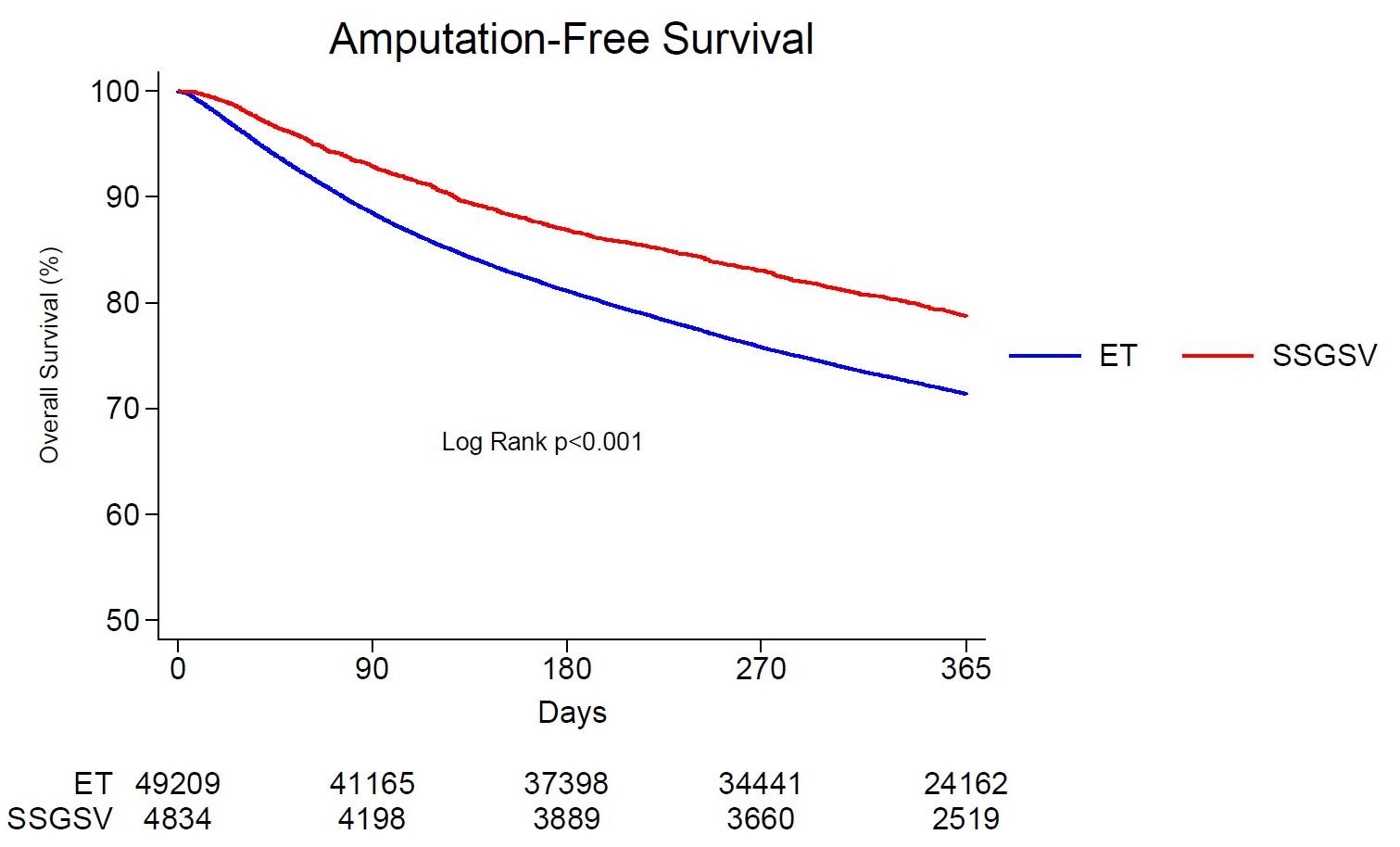 RESULTS:A total of 65,699 patients were included: SSGSV 6,959 (10.6%) and ET 58,740 (89.4%). Compared to ET, SSGSV was associated with decreased hazard of MA/death at one year in patients who are over 75 [aHR=0.77 (95%CI=0.68-0.87), p<0.001], with insulin-dependent diabetes [aHR=0.86 (95%CI=0.78-0.95), p=0.003], on dialysis [aHR=0.79 (95%CI=0.68-0.92), p=0.002], with COPD [aHR=0.76 (95%CI=0.68-0.87), p<0.001], and those who were non-ambulatory [aHR=0.69 (95%CI=0.57-0.83), p<0.001] (Table I). On the other hand, there was no significant difference among both revascularization procedures regarding one-year amputation-free survival in patients who experienced a recent MI (within 6 months), as well morbidly obese patients (BMI>40) and those with a positive stress test prior to intervention (p>0.05). Figure-1 demonstrates greater freedom from MA/death in patients with one or more of the aforementioned risk factors who underwent open bypass compared to ET.